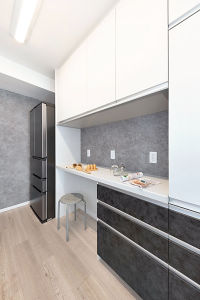 キッチンは、スタイリッシュなヴィンテージメタル柄を採用されました。閉塞感を無くすために吊戸やカップボードの上部はアースホワイト柄を採用。明るく広々としたキッチンに生まれ変わりました。
