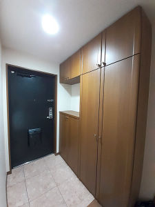 既存のコの字タイプの玄関収納は、カウンター部分が玄関ドア側に設置されており、不便で閉塞感があった。