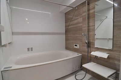 広々とした1618の浴室は、美泡湯と調光付きライン照明でリラックス空間に。窓の無い位置に浴室を移設したので寒さも軽減、浴室暖房乾燥機と相乗で寒くない浴室になりました。