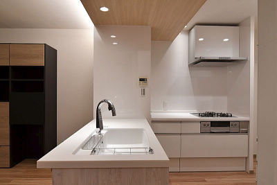 シンクは対面。Ⅱ型キッチンをL字に設置。大きな梁は梁下端に合わせ天井を造作。間接照明を設置。圧迫感のない広々したLDKになりました。