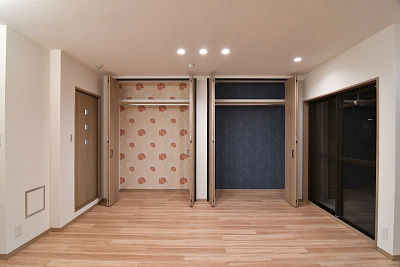 クローゼット内部はそれぞれのお気に入りの壁紙で、衣類を素敵に演出。