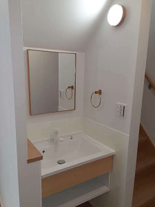玄関入ってすぐ正面にあったニッチ収納を閉鎖、かわりに側面に開口を開けてセカンド洗面を設けました。外出から戻ってきてすぐに手洗いができ、将来、お子様の成長と共に洗面渋滞がおきても回避できるよう、ミラーとコンセントも設置しました。