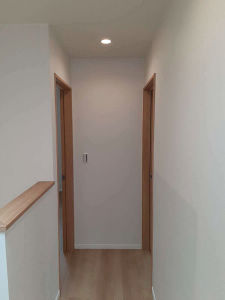 2階廊下の照明は全てダウンライトに変更。スッキリ明るくなりました。内装材も全てイデアオークにまとめました。