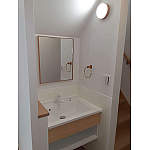 玄関入ってすぐ正面にあったニッチ収納を閉鎖、かわりに側面に開口を開けてセカンド洗面を設けました。外出から戻ってきてすぐに手洗いができ、将来、お子様の成長と共に洗面渋滞がおきても回避できるよう、ミラーとコンセントも設置しました。