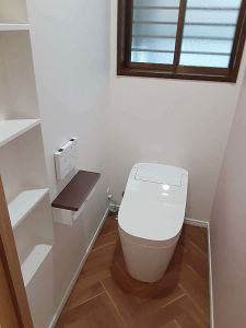 お手入れ楽ちんのアラウーノを採用。建具と照明も取替え、内装も一新。明るく清潔感あるトイレに仕上がりました