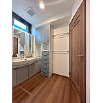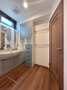 既存の造作洗面台は残し、出入り口、床板を入替。キュビオス収納を設置することで収納も強化