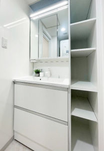 ぴったり間口の収納も確保した洗面を施工させていただきました。
