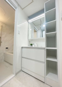 ぴったり間口の収納も確保した洗面を施工させていただきました。