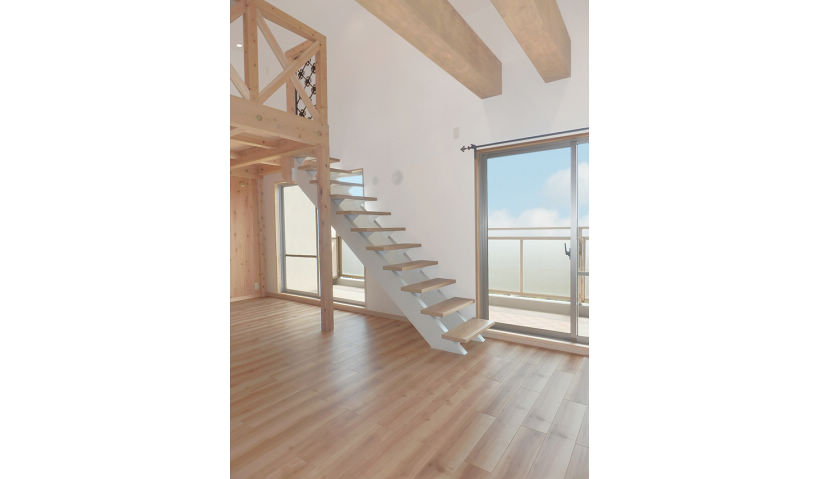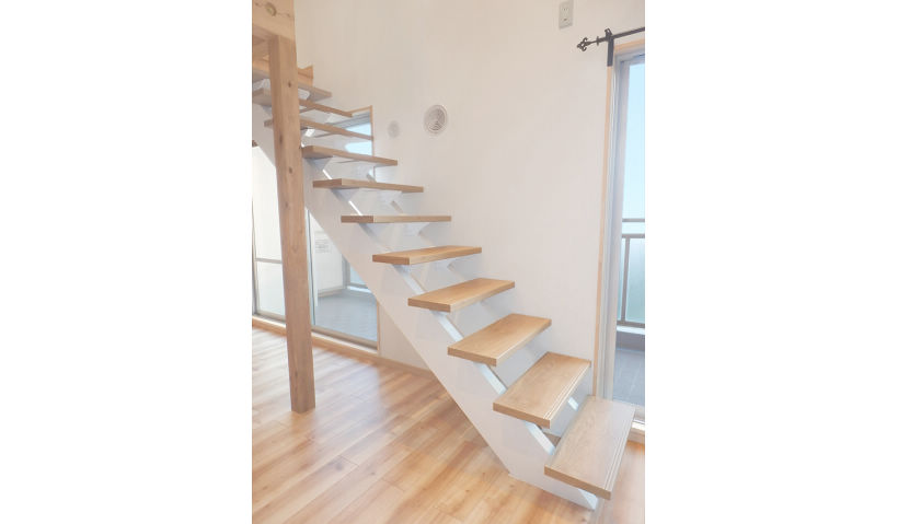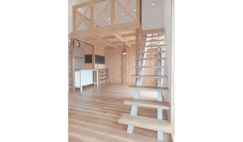 アフター:リビングダイニングと新設したロフトを結ぶため、昇り降りがしやすい階段を設置しました。階下と階上を軽やかにつなぐデザイン性に優れたオープン階段で、開放的な空間になりました。