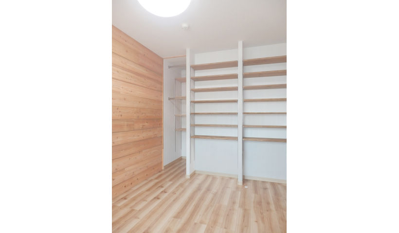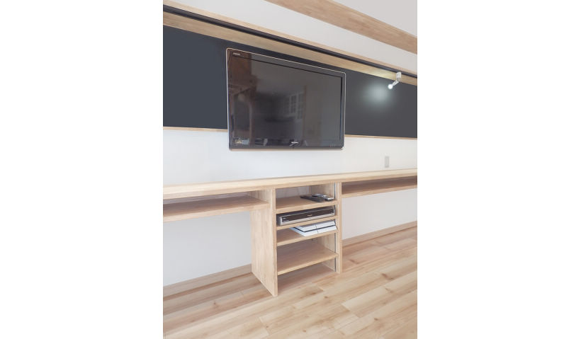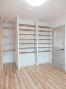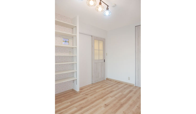 アフター:洋室の子供部屋は、本を効率よく収納できるように可動式の造作棚を多数、設置しました。床のフロアーは、リアルな木目模様のメープル柄のフローリングを採用しました。