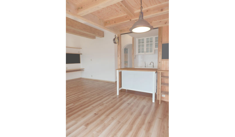 ビフォア:築20年ほどのマンションを購入され入居する前に、水まわり設備や建具、フローリング、収納関係、薄型テレビの壁かけ、内装材の貼り替えなどの全面的なモダンでレトロなデザインリフォーム・リノベーションのご要望でした。また、マンションの最上階のため、天井裏の広くて高い空間を利用して、ロフトを新設されたいとの事でした。