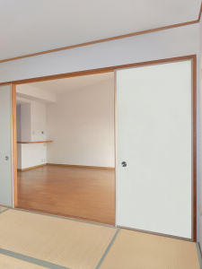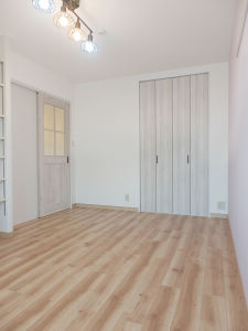 アフター:洋室の子供部屋は、カーペットからフローリングに貼り替え、出入口の開き戸を引き戸に変更しました。メープル柄のフローリングと、ホワイトオーク柄の建具がうまく調和しています。