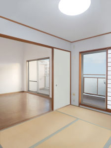 ビフォア:リフォーム前の和室・リビングダイニングです。和室とリビングダイニングから、木のぬくもりを感じられるモダンアートでレトロな空間へ。