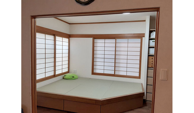 アフター:『畳が丘』を設置。たっぷり入る収納には、ご家族の思い出の品、お子様の成長の記録を収納。南西角で、窓を開けると風通しが良く、冬は日が入り暖かく気持ちの良い空間になりました。