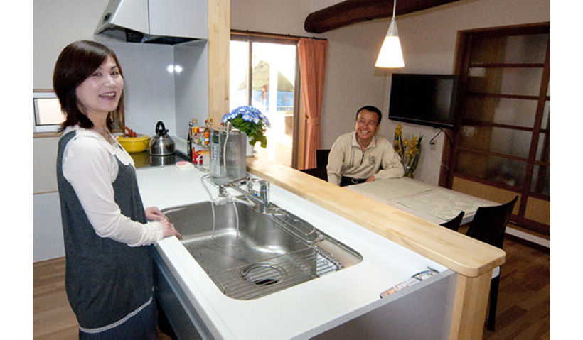 古民家の雰囲気を活かしつつ、対面キッチンに壁掛けテレビという利便性の高いプランをご提案しました。