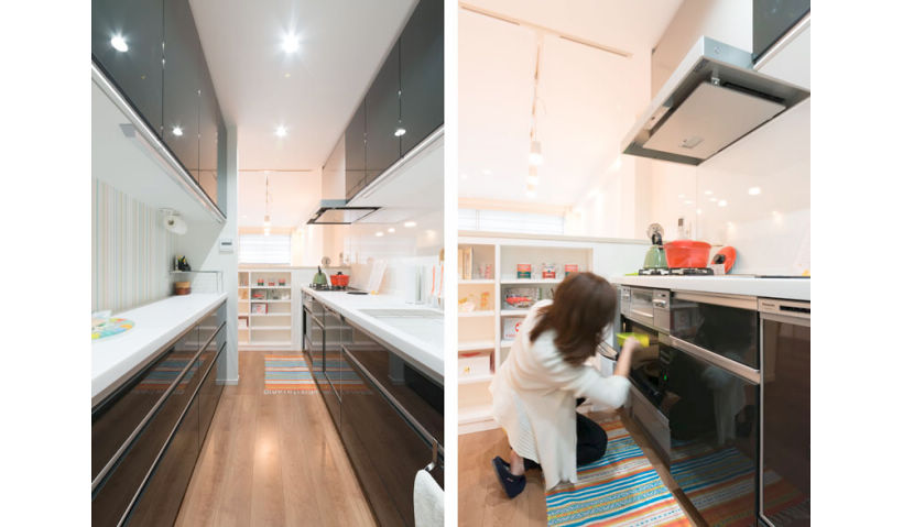 アフター:システムキッチン「リビングステーション」の使い勝手のよさに大満足!シンクが大きいから中華鍋を置いて洗えます。コンロの下にビルトインした電子レンジで食材の下ごしらえをして、鍋にさっと移し替えることができ、お料理中の動線がとてもよくなりました。