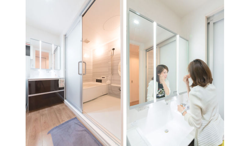 アフター:洗面ドレッシング「シーライン」のツインラインLED照明は顔に影ができにくく、メイクが楽しくなります。システムバスルーム「ココチーノS」の浴槽は足をゆったり伸ばせて、腕や頭もラク。なにより驚いたのは、保温性の高さ。追い焚きしなくてもよくなって助かっています。
