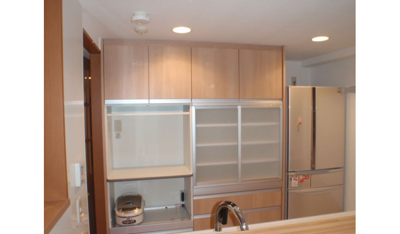 キッチンはリビングとの境をなくし、後部に同じシリーズの収納棚を設置。