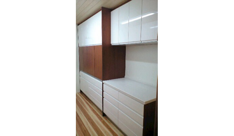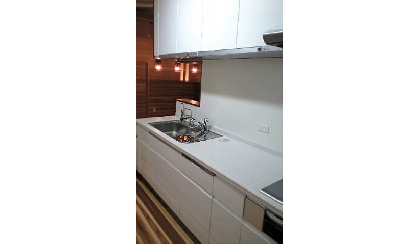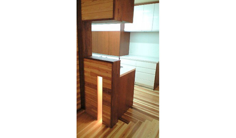 天井・壁・床 全てに無垢材を使用し木の持つリラクゼーション効果とあたたかさを満喫していただき、その中で、キッチン~ダイニング~脱衣室・寝室の導線にも気を付け出入口も車いすが十分使える寸法で提案しました。また限られた台所スペースも天井高を最大限に上げ化粧梁を見せることで空間に奥行を持たせ、壁埋め込み照明で遊び心も取り入れました。寝室につながる廊下の床には畳の縁のない琉球畳を使い、素足で歩いてもあたたかく転んでも安全なように配慮しました。また、この畳の廊下にキュビオスとクローゼットを配置することで廊下を納戸代わりに使っていただけるようにしました。