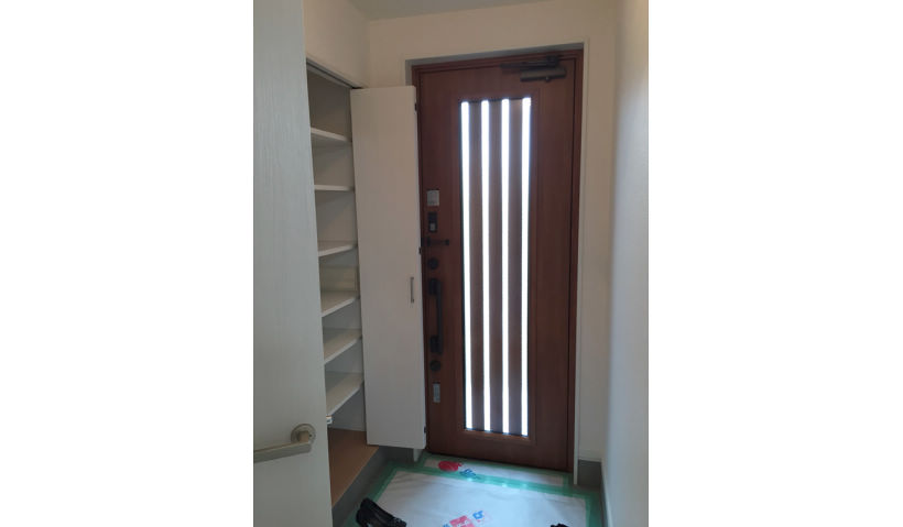 アフター:以前の玄関ドア・風除室を撤去し、現在の断熱ドアに交換。玄関の涼しさ・温かさを逃がさない様になりました。