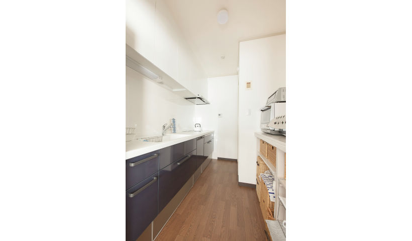 アフター:ショウルームで見て気に入ったネイビーとホワイトのツートンカラーのキッチン。「キッチンも見た目が大事!お洒落な空間ならお料理するモチべーションも上がります」と奥様。奥まっているキッチンでもIHだから熱気がこもらず、夏の暑い日でも快適にお料理できるそう。
