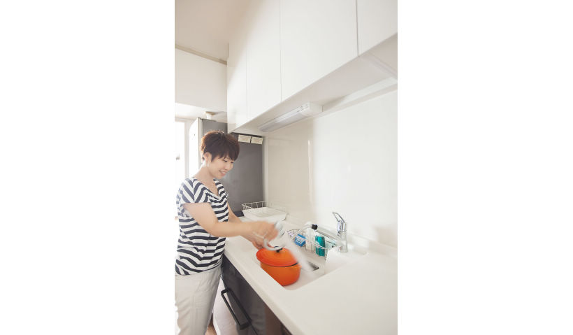 アフター:手前のスペースが広く、フライパンを置いても柄が飛び出てひっかかることがない点もお気に入り。コンロやレンジフードもサッとふけば汚れが取れるので、「キッチンが汚れないんです(笑)いつもキレイでうれしい!」。