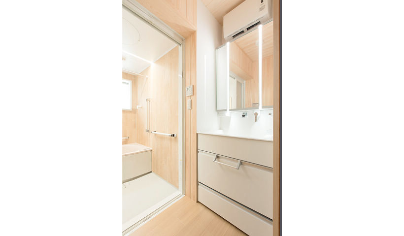 アフター:大きな洗面ボールと明るいLED照明の洗面台「ウツクシーズ」は、タオルなどがたっぷり入る収納もお気に入り。脱衣室としても使うので、暖房も設置。冬でもヒートショックの心配を減らせるようになりました。