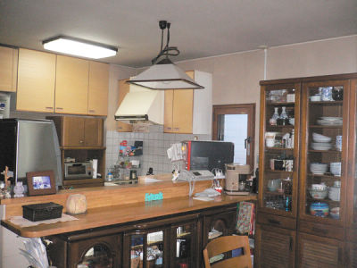ビフォア:キッチンと後ろのカップボードとの隙間が狭く、作業しづらくLDKへの移動もしにくい。収納も少ない。