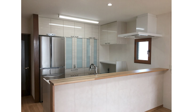 アフター:作業スペースがぐっと広くなり、楽に楽しくお料理が出来るように。収納も充実したのでいつでもすっきりしたキッチン廻りになり、移動もしやすい間取りになりました。