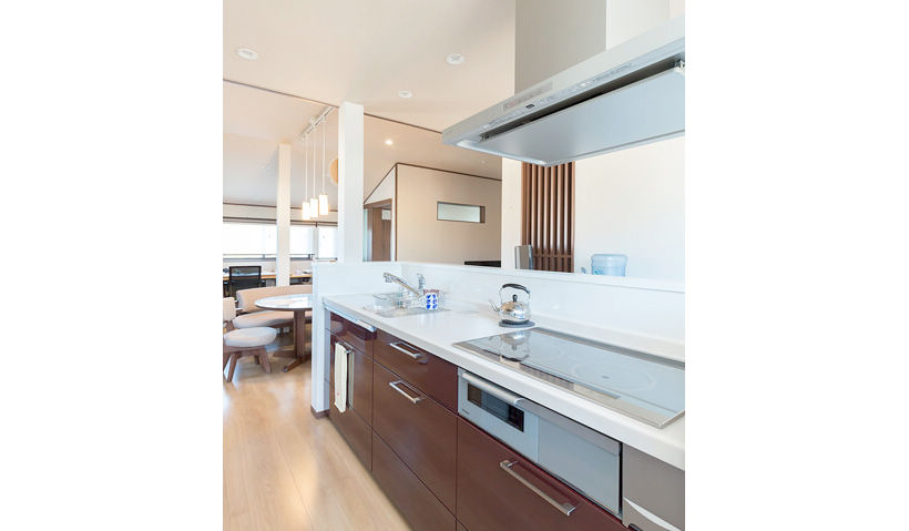 アフター:キッチンの落ち着いた扉色は、奥様がショウルームで実物を見て即決されました。IHクッキングヒーターを上手く使えるか不安に感じておられましたが、「火力調整も簡単ですし、なにより消し忘れがないのがいいですね。外出の際の心配事が減りました」と奥様。