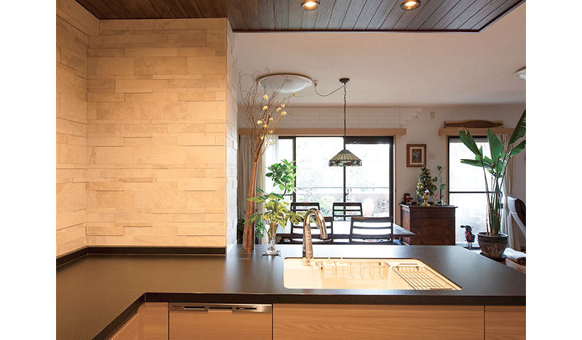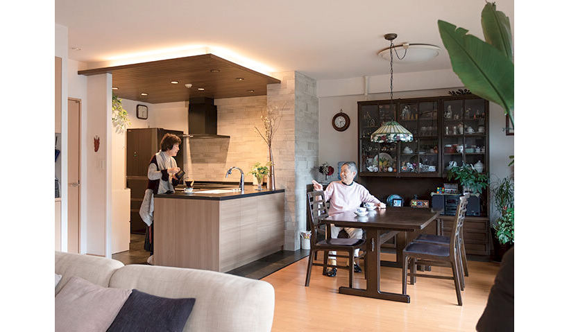 ひとり娘が嫁いで孫が生まれたことをきっかけに、「これからは自分たちの暮らしを楽しみたい」と、それまで迷っていたキッチンリフォームのスイッチが入りました。ほぼすべてのキッチンメーカーを見て回り、パナソニックの展示場にも4回足を運びました。下がり天井をどうするか悩んでいたので、発売されたばかりの天井の羽目板が決定打に。夜はキッチンの間接照明だけつけて、TVを見たりお酒を飲んだり。素敵な雰囲気を楽しんでいます。