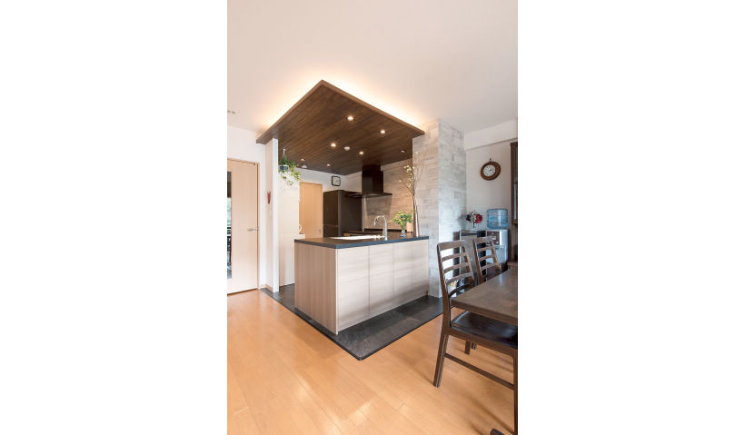 アフター:キッチン部分の下がり天井を活かし、美しく仕上げるためにパナソニックの羽目板を活用。さらにダウンライト照明をあしらうことで、スタイリッシュな大人のキッチン空間が完成しました。