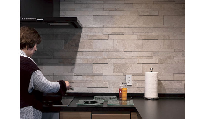 入居時からお気に召さなかったというキッチンの吊戸棚を取り払い、空間が開放的に。イタリア製の凹凸のある壁材が、やはり凹凸のある玄昌ブラックのキッチンカウンターとよくマッチし、ハイセンスなキッチンリフォームに仕上がりました。ダウンライト照明や羽目板上の間接照明がリビングの雰囲気まで一変させ、上質な大人の暮らしを演出します。