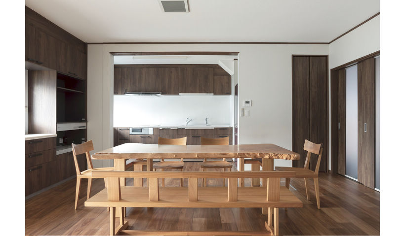大きなケヤキのダイニングテーブルを囲む木の風合いにあふれた住まい。