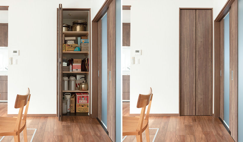 アフター:物置だったスペースには収納棚を設置し、多くの食器や調理器具、ポットなどを出し入れしやすく収納しました。クローゼットドアと右側の引き戸は「ベリティス」のウォールナット柄で統一。美しいコーディネイトと使い勝手のよさを両立させました。