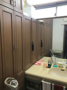 ビフォア:壁一面に造り付られた開き収納に圧迫された洗面室は、洗濯機を置くスペースがなく、使い勝手が悪く暗い空間でした。