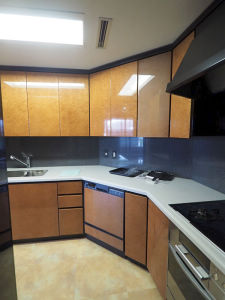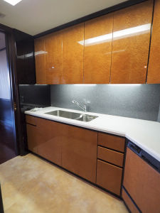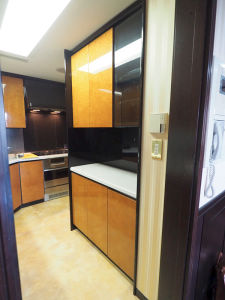 元々のシックな腰壁と建具を生かしたリフォームにしたかったので、ウォールナットの床材は雰囲気が壊れることなくよかったと思います。キッチンはLクラスを使用していたのでマンション仕様になったため、少しキャビネットの引き出しの奥行が小さいかなと思いましたが、使い勝手はとても良いです。