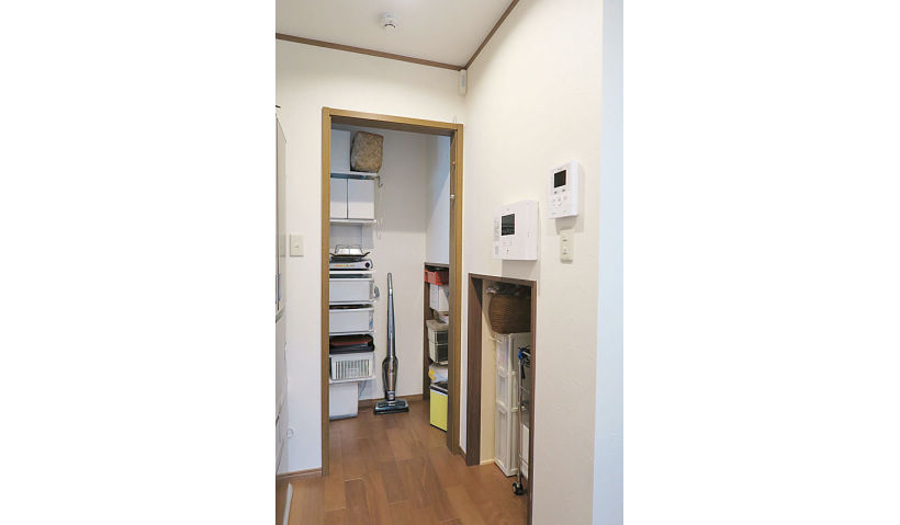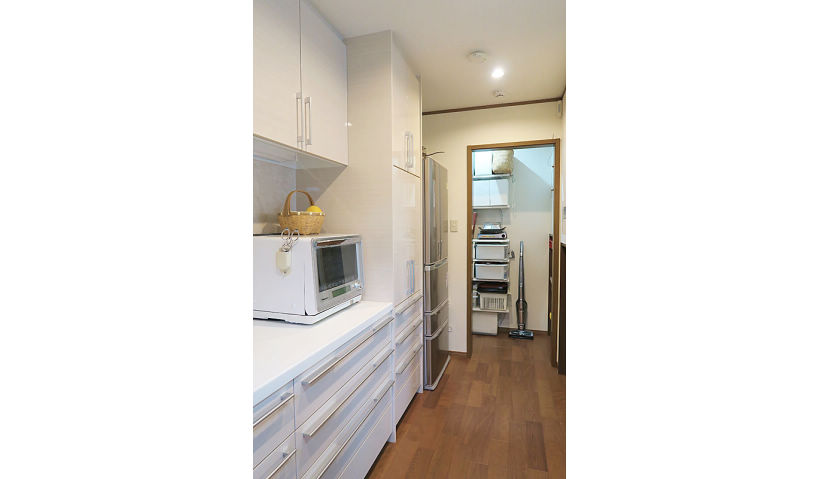アフター:キッチンに充分な調理スペースとレンジ置き場を考慮したので、奥のパントリーまでの通路をゆったり確保。洗濯機を移動してできた奥のお部屋は、パントリー兼ちょっとした作業スペースに。