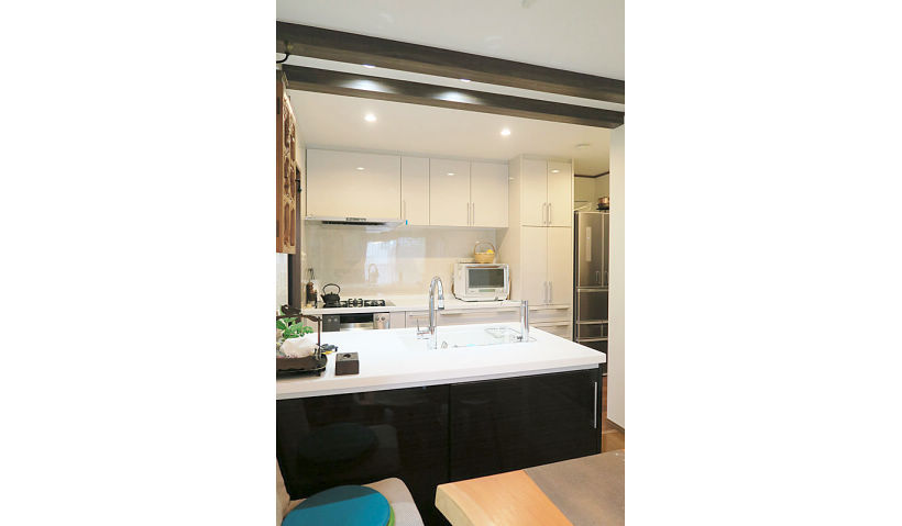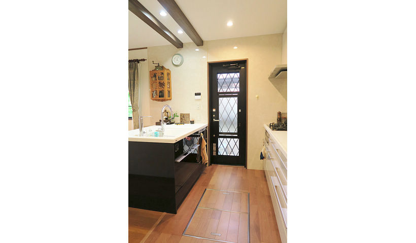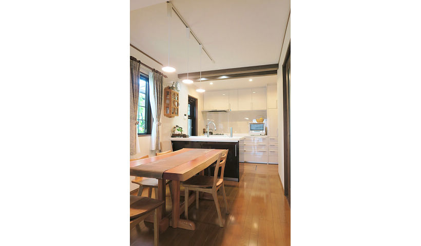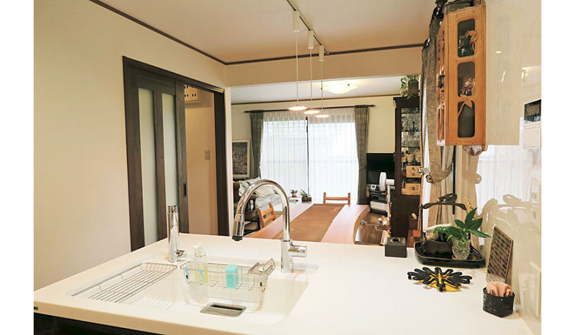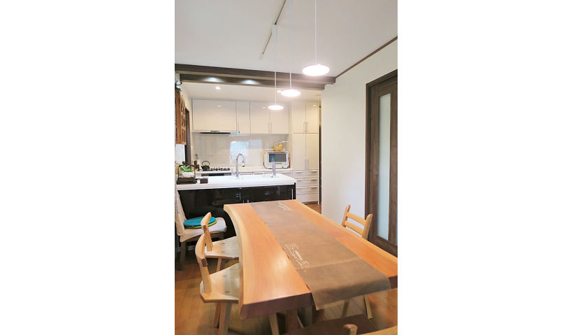 ご夫婦とお孫さんが楽しく会話をしながら、のびのびと料理ができる明るいキッチンの実現を目指し、同時に作業が可能なよう調理スペースにも配慮したⅡ型の対面キッチンをご提案。洗濯機を移動してできたキッチン奥は、パントリー兼ちょっとした奥様の作業スペースにし、階段下も開口し収納としてスペースを有効活用しました。お母さまが作られた想い出の彫刻作品を大切にされていたので、その作品が活きるシックな配色にもこだわりました。補強上残るキッチン上の梁は、シンク側キッチンと同色の木目シートを貼ることで、逆にお部屋が引き締まるアクセントに。照明もダウンライトやパネルミナで、スマートながらも明るく眩しくないLEDで家具との調和をはかりました。
