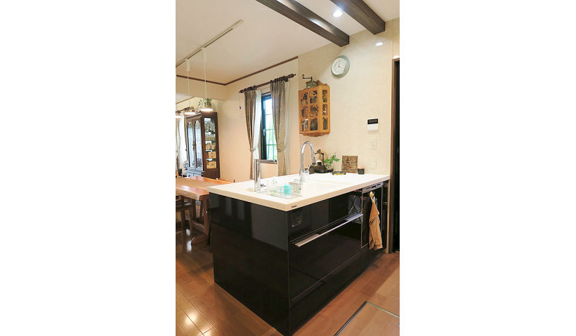 念願だったオープンなキッチンになり、ダイニングやリビングだけでなくお庭まで見通せ、とても快適です。料理中、手を放さなくても会話ができ、ダイニング側からも作業ができるので、主人や孫とも分担しながら一緒に楽しく料理をしています。キッチン本体の収納量に加え、パントリーや階段下の空間も収納スペースになったので、物をスッキリ納めることができるようになりました。また梁がアクセントになり、玄関含め、お義母さまの彫刻作品が活きるコーディネートになりとても嬉しく、友人からも大好評です。洗濯機も洗面室に移動してもらい、とても使い勝手が良くなりました。洗面台やラックで収納量がアップしたので、圧迫感なく使用できています。
