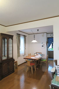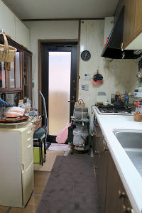 ビフォア:壁で仕切られたキッチン。ダイニングと断絶されているので、会話や作業が途切れたり、お孫さんに目が行き届かなくなるのが、お悩みでした。