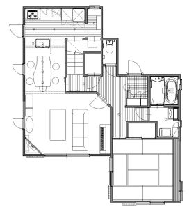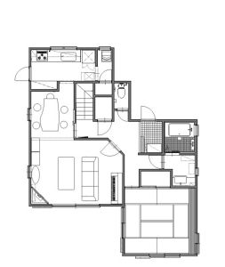 ビフォア:奥の個室キッチンが閉鎖的で暗く、会話や作業が分断され、お孫さんにも目が行き届かないのがお悩みでした。洗濯機がキッチンの奥にあって使いづらく、またサッシも操作しづらく、風の通りも良くない状態でした。気密性を上げたい玄関ドアや浴室は、特に冬場寒く、玄関先も暗く収納量も足りていませんでした。