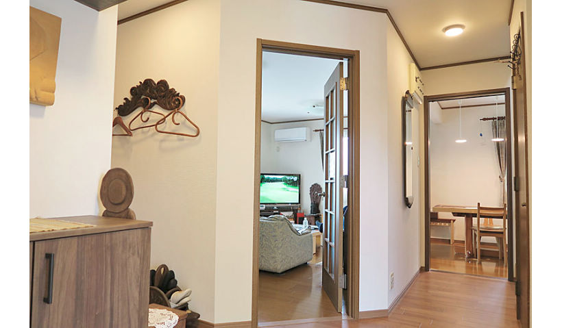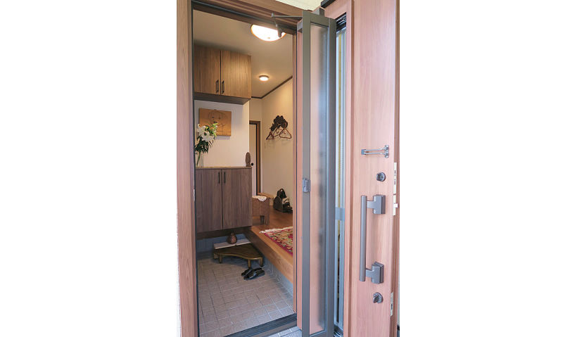 眩しさを抑えた明るいLEDへ照明をお取替えし、玄関ホールは人感センサーで夜帰宅された時も明るく。玄関収納を大きくして収納量を増やし、お母さまの彫刻作品が映えるカラーコーディネートに。床フローリングは増張りして、以前床暖房をしたダイニング・リビングの床との段差をなくしてバリアフリーに。採風タイプの玄関ドアで、風の通り抜ける明るいお住まいになりました。