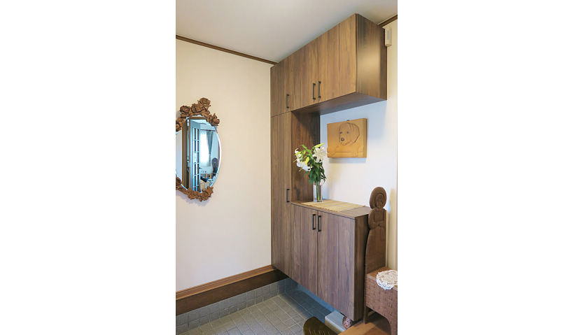 アフター:コの字収納にすることで、トール収納を入れても圧迫感なく。ウォールナット柄が、お母さまの彫刻作品とも調和して、風格ある玄関になりました。