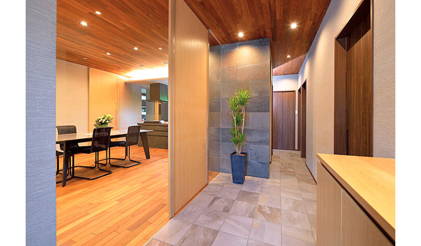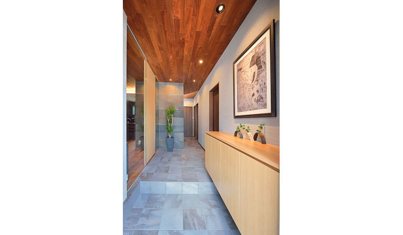 お家の顔である玄関はドアを開けた瞬間のインパクトを重視しました。土間からホールの床、壁の一部をタイルで仕上げ、天井を板張りに。すっきりとデザインしながらも重厚感のある空間を目指しました。また、建具にベリティスを採用したことでバリアフリー化も実現。LDKとの間に設置したハイスライドドアなど、開放感の演出にも役立ちました。