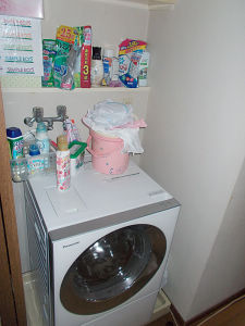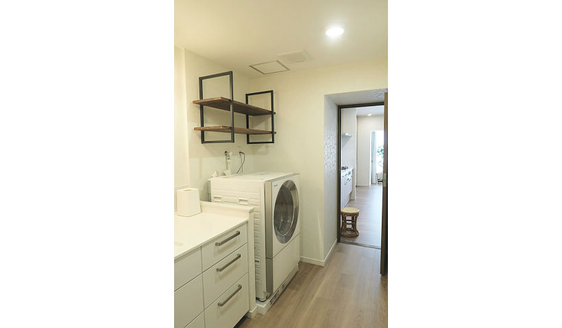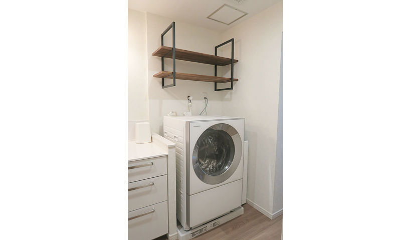 アフター:よく使用するものや仮置き棚として、洗濯機上にフレームシェルフを採用。洗面台や洗濯機の上に物を置いて乱雑になるのを防ぐ効果も。
