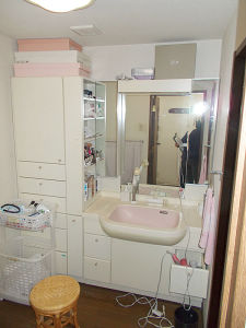 ビフォア:元々広い洗面室でしたが、洗面台も古くなっており、お子様の独立に伴い持て余しがちになっていたトール収納が空間に圧迫感を与えていました。