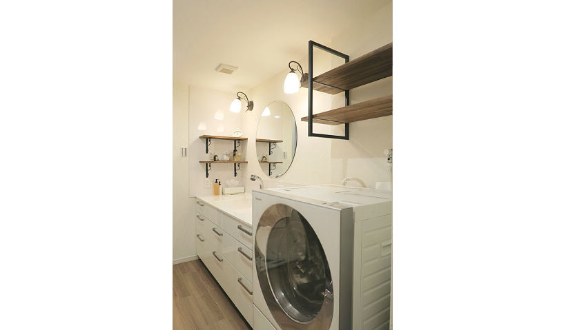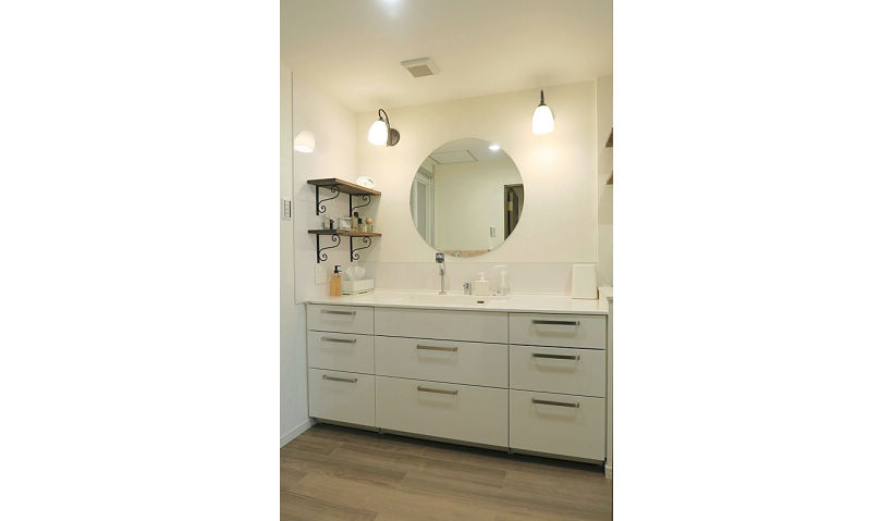 ユーティリティは洗濯機置き場のみで、洗面室との間仕切り戸は開けっ放しで利用されていなかったので、間仕切り壁を取り払い広々とした1室にしました。ラシスのフロアキャビネットの収納が充実しているので、トール収納はなくして、W1650のワイドな洗面化粧台に。元々広い洗面室でしたが、間仕切り壁を取り払うことでよりゆとりある空間が確保でき、ワイドな洗面台とサークルミラーがホテルライクな空間を演出し、おしゃれな洗面室に仕上がりました。洗濯機上のフレームシェルフと同じ棚板を使って、洗面横にもアイアンアングル固定棚を取り付け、ブラケット照明と共に、空間の良いアクセントとなりました。