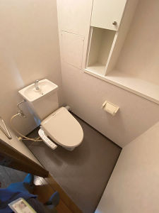 アフター:アラウーノの手洗い付きタンクレストイレを採用した。奥様の選ばれたクロスがよりグレードアップしたトイレ空間に繋がった。