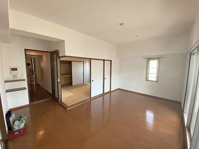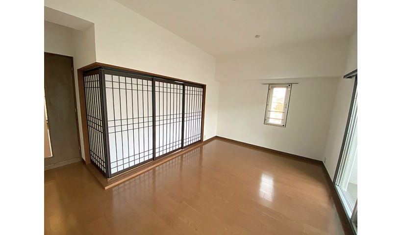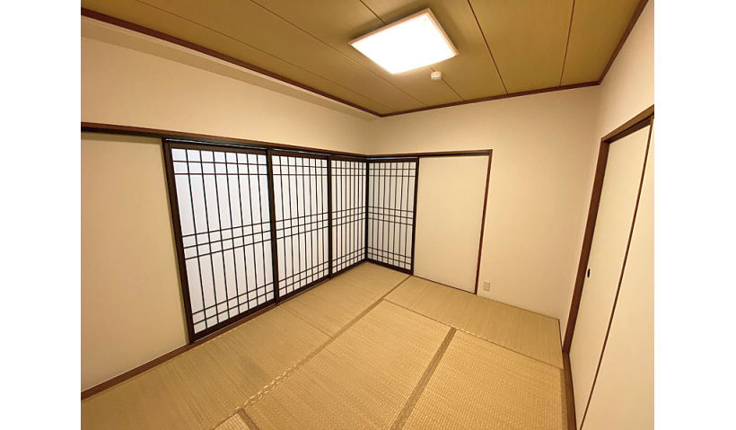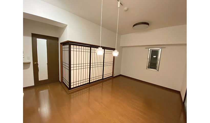 和室は押入の内装を一新し、シナベニヤで張り替え中段・枕棚も新設した。畳の表替え等の内装工事に加え一番印象をかえるのはリギングからもみえる建具の特注でありアルミ製のフレームで上吊りにし、鴨居長押は再利用してコストダウンをしつつ綺麗に見えるようなものを提案。